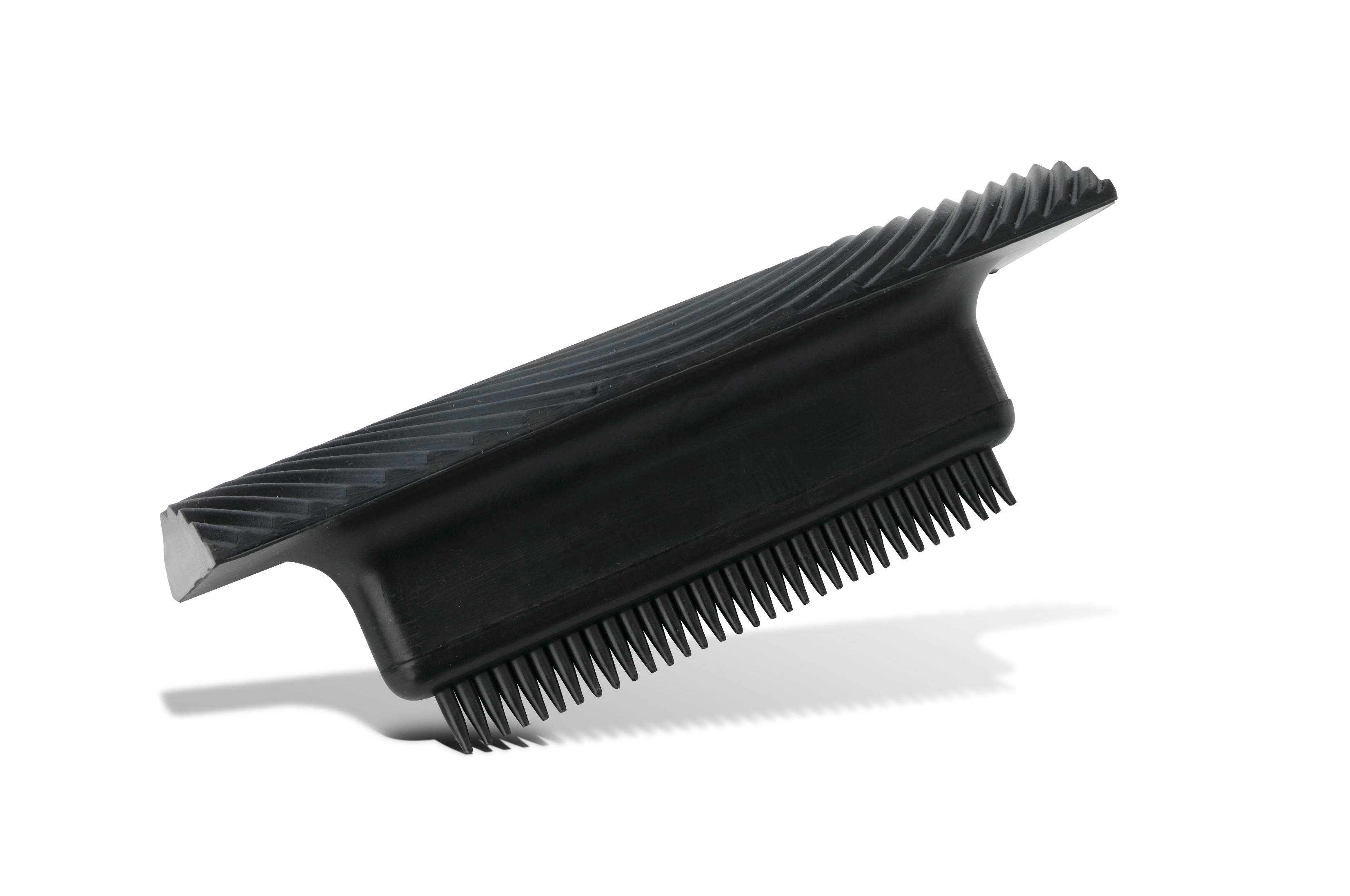 Aus schwarzem Weich-PVC, eine Seite mit gewölbter Maserierfläche, andere Seite mit Kamm.